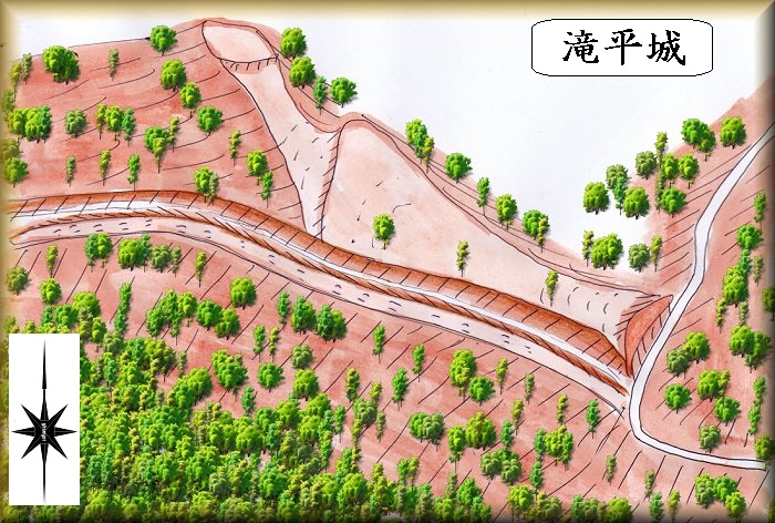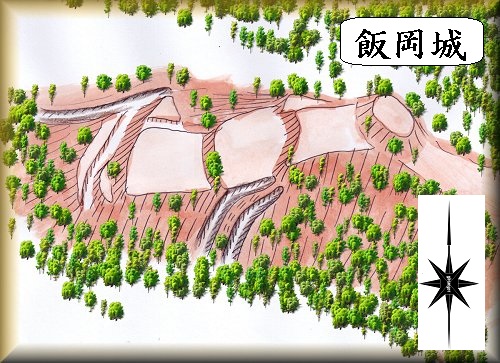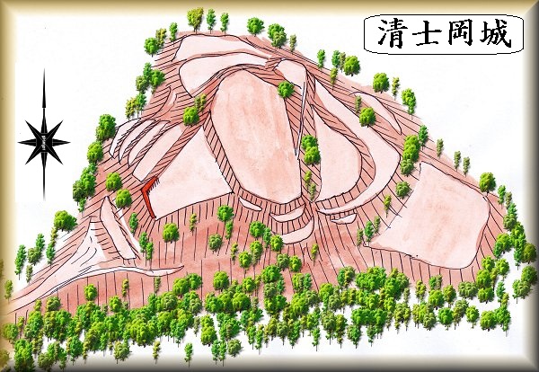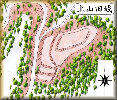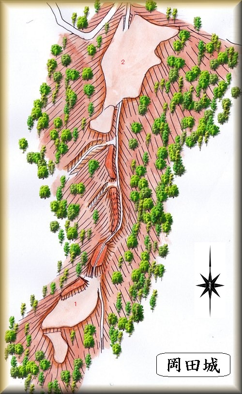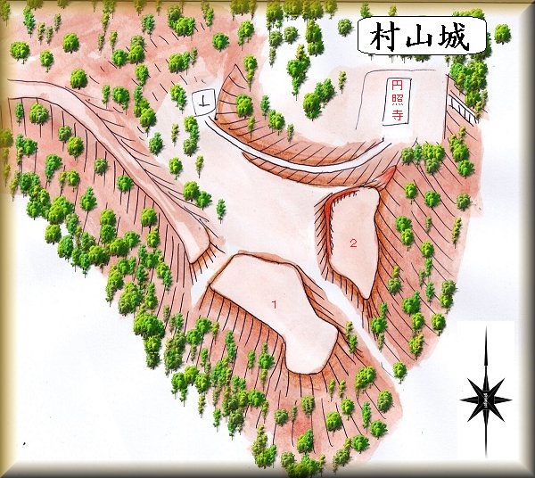 北側に吉祥寺という寺院があり、その辺りから取り付いてみようと思ったのであるが、予想外に竹ヤブがひどくて、入り込むことができなかった。鳥瞰図は上記の書に頼り切ったものである。