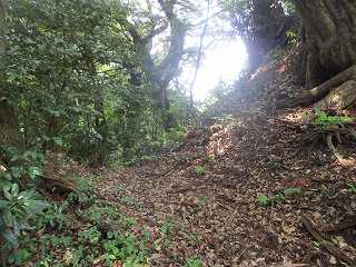 比高30mほどの山稜であるが、南側のすぐ下を道路が通っており、民家の背後の山稜となっている。こちら側からだと簡単にアクセスが可能であるが、民家の敷地の奥に当たるので、このお宅の許可を取ってから入った方がよい。