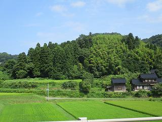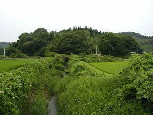 写真の左側の山中が城址ということになる。右手の水田中に見えるのは「岡田の松塚」と呼ばれる塚で、かつてここに松がたくさん生えていたというが今はない。塚も削られて小さくなってしまっているという。