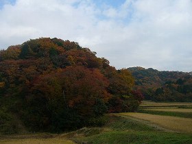 | 西側の花輪地区の水田地帯から見た天羽城。右手奥の山が城址である。左手前のきれいに紅葉している尾根から取り付いたのだが、城址までは到達できなかった。 | 途中にあった土塁のようなもの。土塁の向こうにも細長い平場があって明らかに土塁状に盛り上がっているが、これは手前の切り通しの道をつける際に生じたものであろう。 |