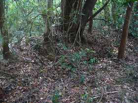 | 上の道のすぐ脇の茂みの中にあった井戸と思われるもの。藪の中にあるので、落ち込まないよう気をつけたほうがよい。 | 6の郭。かなり広い区画であり、多くの人員を収容することも可能である。 |