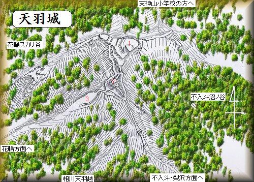 天羽城はかなり奥深い山の中にある。天神山小学校の東南1kmほどのところで、どの方向からアクセスするにしても、かなり長い尾根に沿って山中を歩いていくしかない。麓からの比高は90mほどある。