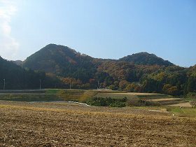 | 東側から見た二又山(左側)。地元では「ようげい」とも呼んでいる。尾根が北側に長く延びているのが分かる。 | 北側から見た二又山。なるほど確かに山頂が二又に分かれているように見えなくもない。こうしてみるといかにも城山といった雰囲気のある山である。右手前の部分が畑になっている6の郭である。 |