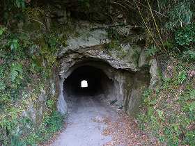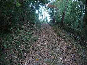 | Aの部分のトンネル。岩盤を繰り抜いたもので車一台がやっと通れるような広さである。西側の君ヶ谷観音堂の方からここに来られるのではないかと思われる。 | 6の郭の畑に上っていく途中の道。この部分のすぐ左手の脇に井戸らしきものがある。 |
