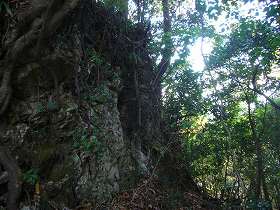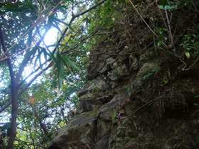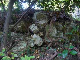 | これも虎口の一種であろうか。Dの部分である。土塁状の高まりの脇に切り通しを置いて、そこを通るようになっている。 | 堀切1の周囲には岩盤が露出しているが、このように石積みのように見える部分もある。 |
