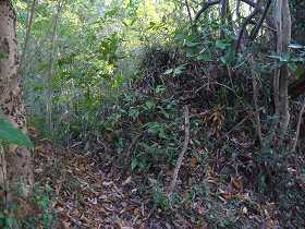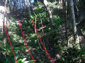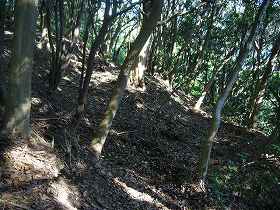 ここから西側が城域ということになるのだが、西側は尾根が次第に上がっていくという地形であり、郭とはなっていない。しかし、途中の左右に一箇所ずつ、脇を削ったような跡があった。竪堀の一種のようにも見えるが、はなはな半端なものである。