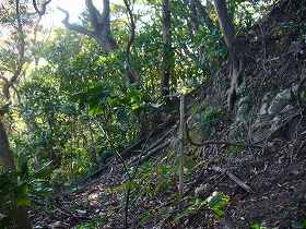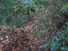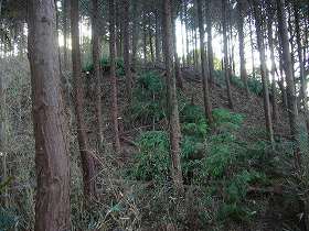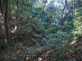 | 南側の斜面には数段の腰曲輪のようなものがあるが、段の高さが1m程度しかなく、むしろ段々畑の跡と見た方がよいかもしれない。 | Bの見張り台の西側下にある切り通しの通路。左側の土塁の外側も削られ、竪堀状態になっている。 |