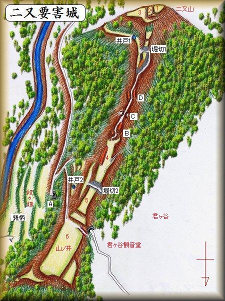 | (以前の記述)君ケ谷城は館山自動車道のインターのすぐ南側にそびえている二又山と呼ばれている山の上にあった。この山は富士山のように形の良く整った山で、比高110mほどある。城址には土塁、空堀、井戸などが残っている。二又山の山頂が本丸にあたり、2つの郭に分かれていて、要害と呼ばれている。山頂からは東に尾根が長く延びており、ここが二の丸となる。東西に細長い郭である。その先が三の丸で、ここは比高20mほどの台地でかなり広く、畑地となっている。 史料には出てこず、城の歴史や城主については分かっていない。 |