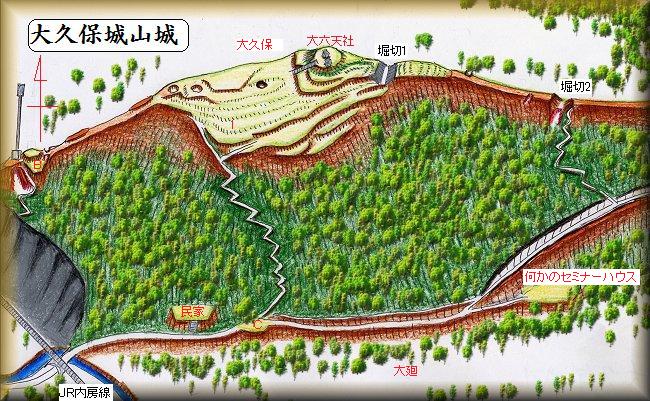 | (以前の記述)大久保城山は、金谷城の北東1km、富津館山道路とJR線との間にある。比高100m近い山である。富津金谷インターチェンジのすぐ南西側にあたり、高速道によって北側が削られている。城山というのでなんらかの城郭施設があったものと思われるが、伝承等はない。金谷城との距離を考えてみれば、金谷城の出城、あるいは連絡のための砦といった意味合いがあったのかもしれない。 | |
