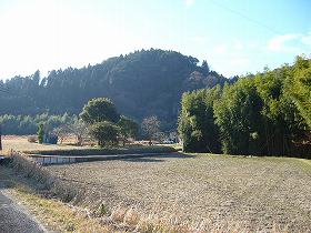 この観音堂の背後に見える比高40mほどの山が城址である。城に一番上りやすいのが、集落の奥へと進んでいって、台地を上がり、墓地の脇のトンネルの辺りから取り付くコースであろう。トンネルの上にはすぐ堀1が見えている。ここを上がれば堀1を経由して城内に入る事が容易である。ただし、この堀1、粘土質の岩盤を掘り込んだ、深さ8mほどもある大規模なものなので、気をつけて登らないとかなり危ない。