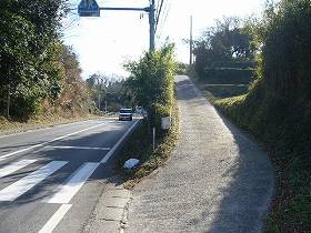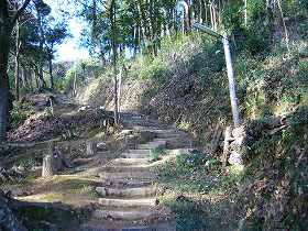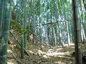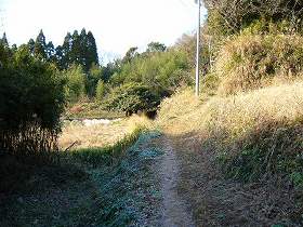 | 国道297号を南下すると平蔵橋を渡ってすぐに、城に上がっていく道が見える。ただし、車は、このすぐ脇の集会所に置くのが無難である。 | 切り通しを抜けると細い山道となっていく。周辺には面積の広い畑がいくつもある。 |