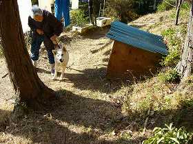 | 最後はこういう山道となっていく。この上に一軒のお宅がある。 | わんわん吠える犬をおさえてくれたおばあちゃん。どうもありがとうございます。 |