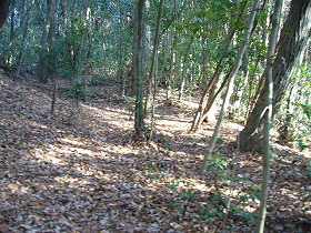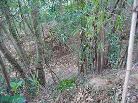 下から竹林をよじ登っていくとAの窪みに出た。こうした窪みは、この城の腰曲輪には何ヶ所かにあるのだが、これも一種の内枡形のようなものであったろうか。この下の斜面には大規模な竪堀のようなものが3つある。規模が大きいので自然地形かとも思われるのであるが、その横が縦土塁状になっている部分もあり、やはりある程度加工し、斜面の横移動を妨げるという効果を狙っているようである。