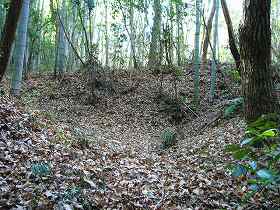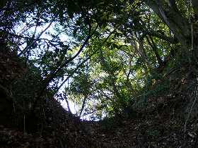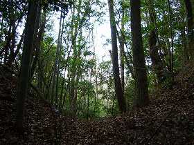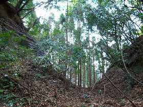 | 堀1。岩盤を10mほども掘り切った超ど級の堀切である。千本城の大堀切に雰囲気が似ている。これを登るのが大変だった。 | 堀3。深さは4mほどである。3郭側は、堀に面する城塁の中央の切り通しから上がるようになっている。 |
