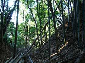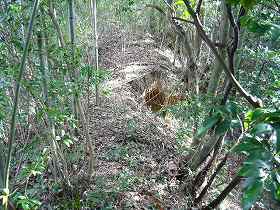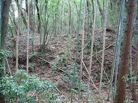 | 尾根の先端下にもきちんと堀切が入れられている。 | 尾根の両側は削られ、よじ登れないようになっている。 |
