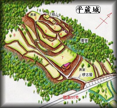 このように平蔵城は、畑地となっている平坦な郭を段々に配置しただけの、わりあい単純な構造の城郭である。とはいえ上記の通り、郭数はかなり多く、多くの人数が籠城する事も想定されている。「要害」「根古屋」といった地名からも、戦国期の城であることは明らかであり、ある程度拠点的な規模の城ということができるのではないだろうか。ただ、ちょっと気になるのが、この山を「しろやま」と呼んでいるらしい点である。中世城郭の場合だいたいは「じょうやま」と呼ぶのだが、なぜここは「しろやま」なのであろうか。