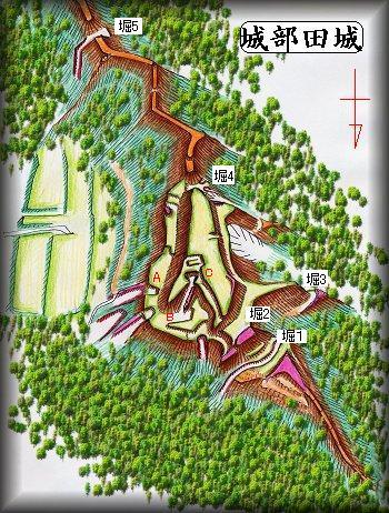 | (以前の記述) 平蔵城のすぐ北側に続いて城部田城がある。台地の基部が平蔵城とつながっており、出城として築かれたものであろう。台地の先端部にあるのが主郭と思われる郭で、その周囲には腰曲輪がある。主郭から台地の基部に向かって、2つほど細長い郭があるが、その間には空堀が掘りきられている。 |