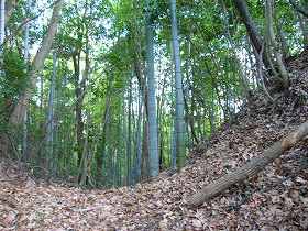 | 東側の国道方向から見た城部田城。 比高50mほどの山の尾根を利用したものである。 | 1郭下の腰曲輪。この腰曲輪の途中にも、段差がいくつかあり、横移動を防止するようになっている。 |