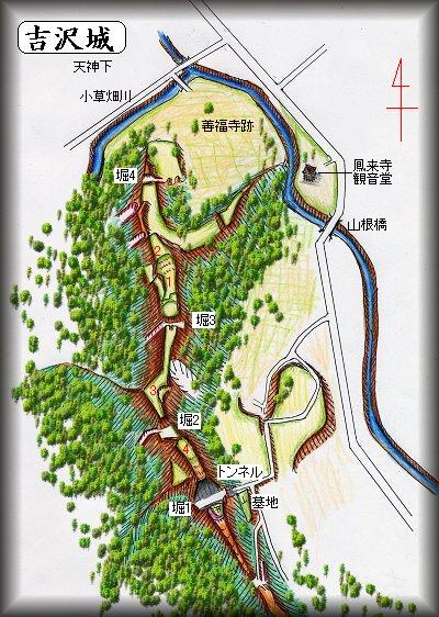 さて、ざっと見てきたとおり、吉沢城は、細尾根を加工して郭を造成した城郭であるが、尾根がもともと細いので、山上にはそれほど多くの人員を配置する事はできない。しかし、堀切にはかなり力を入れている。特に最も台地基部にあたる堀1は非常に大規模な工事を必要とされるもので、多くの人員によって工事が行われていた様子を想像することができる。