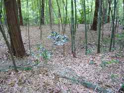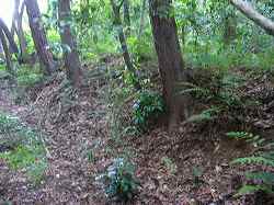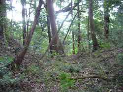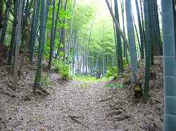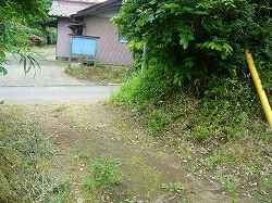 | 東側下の枡形の窪みを見たところなのだが、写真ではなんだかよく分からない。 | 台地基部の方に上がる道。上がり口は虎口のように見える。 |