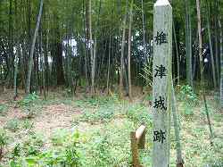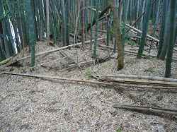 (以前の記述)椎津城は、八坂神社の裏手の20mほどの台地上にあり、主郭部はその遺構をよくとどめているようだ。ただし、私有地なのか竹垣で囲まれていて内部に立ち入ることはできなかった。写真は、主郭部の城塁だが、攻撃しにくいように鋭く削られている。 |