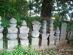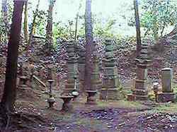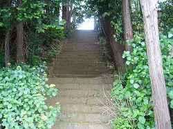 | 学道寺の石段。学道寺は、高さ10mほどの所にある。そのさらに背後に当たる公家台と呼ばれる広大な台地が城址ということのようである。 | 寺院背後にある古い墓石群。城主となんらかの関係があるのだろうか。 |