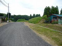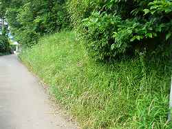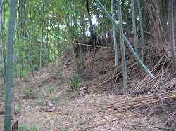 | 北西の墓地の中にはかなり古い墓もある。この先は高さ3mほどの断崖となっている。 | 西側の土塁を外側から見たところ。本来は堀があったのであろうか。 |
