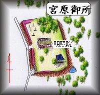 宮原の明照院が御所跡と呼ばれている部分である。実際に明照院を訪れてみると、山門の脇には土塁がのびており、道路との間に明確な区画性を感じる。さらに寺院の北、東、南の三方向は、比高5mほどの土手となっていて、寺院のあるところが、東側につきだした地形であることが分かる。このようなことから、40m×60mほどと、小規模ではありながら、明照院にはかなり明確な区画性があったことが理解できる。この寺院の境内がそのまま、居館の跡であったと見てもよいのではないかと思われる。