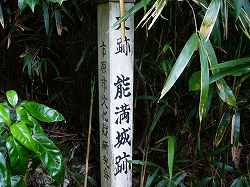 | (以前の記述)能満城は、市原城の800m東南にある。比高15mほどの台地上の奥である。府中日吉神社の所から、北に向かって細い道を入っていくと、しばらくして森の中に土手が見える。この土手の周囲を歩くと、写真の「史跡能満城跡」の標柱があり、すぐ奥に虎口が見える。その奥が主郭部分であろう。虎口の両側は5mほどの土塁になっている。主郭部分はその中で、50m×100mほどで、あまり大きくないが、その周囲にもいくつかの郭があったであろう。虎口周囲の土塁はよく残っている。 この標柱に書いてある説明によると、この城は里見義堯が前線基地として築城したもので、里見方の武将が守っていたという。 |