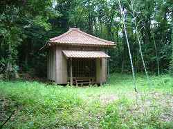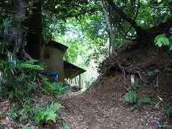 | 北の城跡山の尾根基部側にある堀切。深さ2m程度と小規模で、堀切というよりもただの通路に過ぎないのかもしれない。 | 城跡山にある軍茶利四天王の社殿。 |