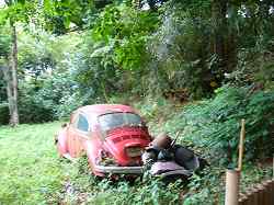 | 虎口から東側に延びる土塁の内側には、なぜかワーゲンが捨てられている。 | 西側の土塁を郭内から見たところ。かなりしっかりとした土塁である。 |
