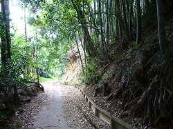 | 北西側の土塁。こちらはそれほど大規模ではなく、高さは1,5mほどである。この下が切り通しの通路となっている。 | 左の土塁の外側下の切り通し道。ここからの城塁の高さは6mほどである。 |