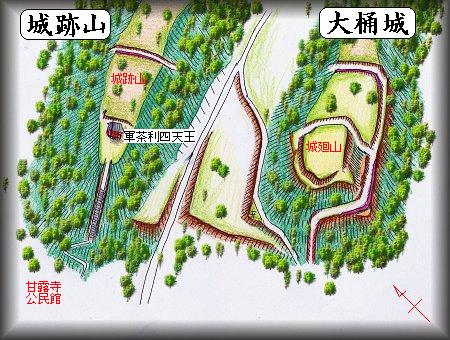 大桶の甘露寺の東側の比高40mほどの山を城跡山、その南側のやはり比高40mほどの山を城廻山と呼んでおり、「城郭体系」では、その両方に城があったとしている。ただし「市原の城」では、城跡山の方は城と見るには問題が多い、とする。