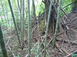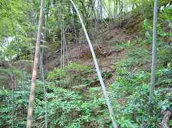 | 横堀の底は西側でいったん広くなり、そこから竪堀となって山麓まで落ちていく。これはそのテラス部分の城塁。 | 山麓まで続く竪堀。ヤブがひどくて分かりにくいが、深さ2mほどの規模で延びている。 |
