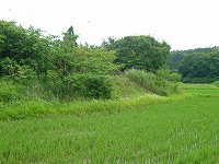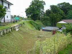 | 北側から見た1郭城塁。しかし本来の「ゆうがい山」は高さ5mほどはあったらしい。 | 「東門」の辺りにわずかに残る堀跡らしき部分。 |