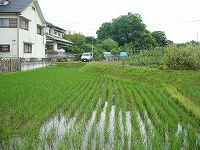 | 城の北側下にある八坂神社。背後に見える比高15mほどの台地が1郭になる。 | 1郭の北側下にはこのような段々の田んぼがある。これは郭なのか、それとも後世の改変に過ぎないのか・・・。 |