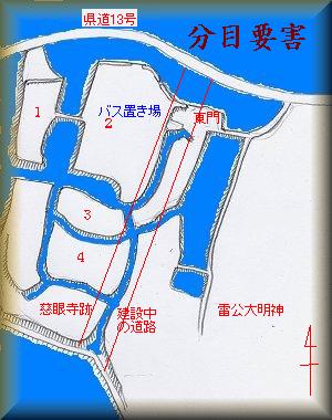 分目要害は、県道13号線の南側の低湿地にあった。慈眼寺や雷公大明神の西側一帯であったらしい。かつてここには「ゆうがい山」と呼ばれる低い台地が存在し、幅の広い堀で区画された数郭が存在していたようであるが、宅地化やバス置き場を設置するための工事によって、ほとんどが破壊されてしまったらしい。なお、このバス置き場には「無断立入すると罰金1万円をいただきます」とか書いてあるので注意した方がよい。