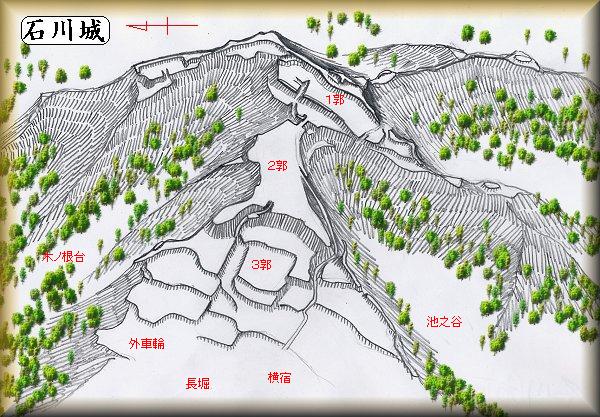 石川城は、現在、「太平洋クラブ市原コース」というゴルフ場となってしまっているために遺構を確認することはできなくなってしまっている。そこで『市原の城』に掲載されている図面を基にして鳥瞰図を描いてみた。