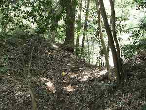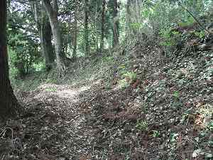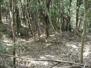 | 堀4。けっこう深く6mほどある。この堀の南側の尾根には堀5、堀6があるが、こちらはきちんとした堀切ではなく、土橋を残して、片側に竪堀を入れたような形状をしている。 | 南側の尾根とを区画する堀7。堀幅が7mほどある。ここから南側にはだらだらと尾根が延びていくが、防御遺構はここで終わりのようである。 |