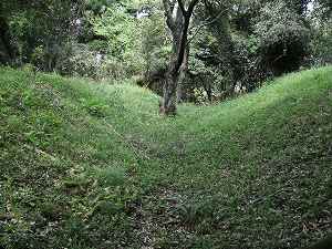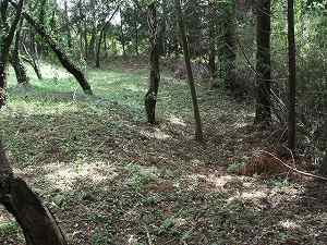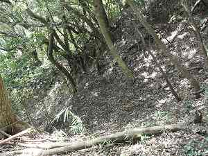 | 上の穴はこのU字型の堀に接続している。この堀も近代の改変によるものであろうか。 | 堀3。深さ6mほどある。この城は支尾根を堀切できちんと区画している。 |