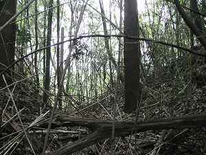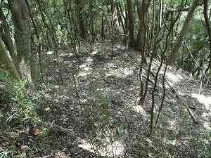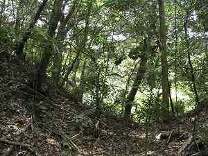 | 堀7の西側下には切り通しの虎口状の部分があり複雑な地形をしている。これも防御遺構の一種なのであろうか。 | 2郭東南側の腰曲輪。2郭も笹薮がひどくて形状をきちんと確認はできなかった。 |