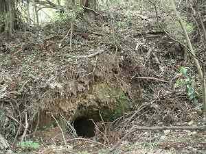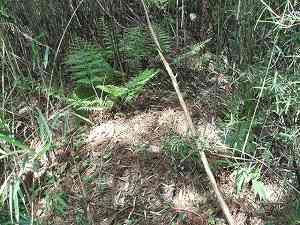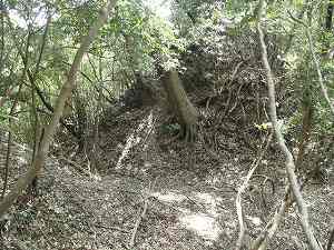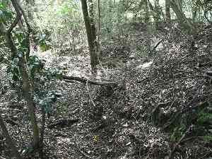 | 5の郭にある仕切り土塁。しかしこの辺りは笹薮がひどくてよく分からない。 | 6の部分の下には近代的な加工を施された穴がある。水路でも通そうとしたのであろうか。 |