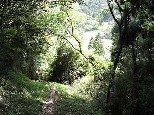 | 上の腰曲輪の脇には崩落の跡か、崖があるが、まるで巨大な竪堀である。 | 4の郭脇の登城道を降りていく所。麓がけっこう下に見え、なかなか眺望がよい。 |