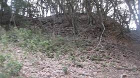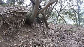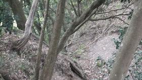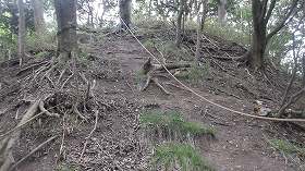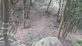 | 1郭西側の急斜面下にある堀切。この下にもあり、2段構造となっている。 | 1郭西側城塁を下から見上げた所。急斜面であり、ロープがないと登るのは難しい。 |