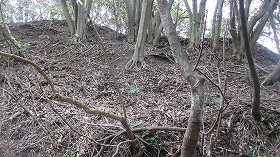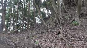 ピークが見えてくると、切岸状の地形が目に入ってきてやっと城内に入ったことが分かる。まずは数段のテラス状の郭を経由することになる。そのうち2段目の郭の周囲には土塁の痕跡らしきものが見える。『安房の城』はこれを池の跡として認識しているが、なるほど、高所の山城であるだけに、水を貯めておく施設を設置することは必須のことである。
