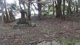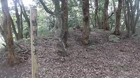 | 3郭の内部。祠が祭られており、周囲には土塁もある。 | 同じく3郭に建つ『鴨川富士」の標柱。 |