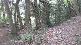 そこから先へも進んでみたが、道が山の上の方にまで行きそうになかったので、この道を進んでいくのはあきらめて、その辺りから斜面を直登することにした。だがこの直登はとても疲れる。傾斜が急で滑りやすいため、何かにつかまっていないととても登れたものではない。それでも比高で30mほど登って、何とか尾根上に出ることができた。