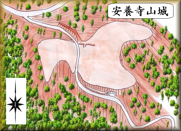 安養寺館(金井町安養寺) 安養寺城の東の山麓で、安養寺の北西の低い台地上にあった。方50mほどの郭が3つ連郭式に並んでいるというが、現状では、明確な区画を見ることはできない。