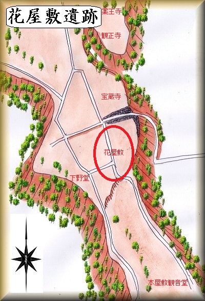 宝蔵寺の南側一帯が花屋敷遺跡の跡であるというが、特に遺構が見られるわけではない。
