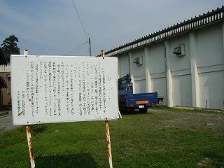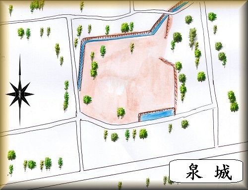 泉城は、正法寺の東側で北野神社の一帯にあったと言われる。現在、写真のような案内板が立っているが、文字もかなり消えかかっており、肝心の「泉城址」という部分が読めないので、一見、何の看板かもわからない。(その後訪れてみると、案内板は新しくなって読めるようになっていた。案内板の場所はここ。)